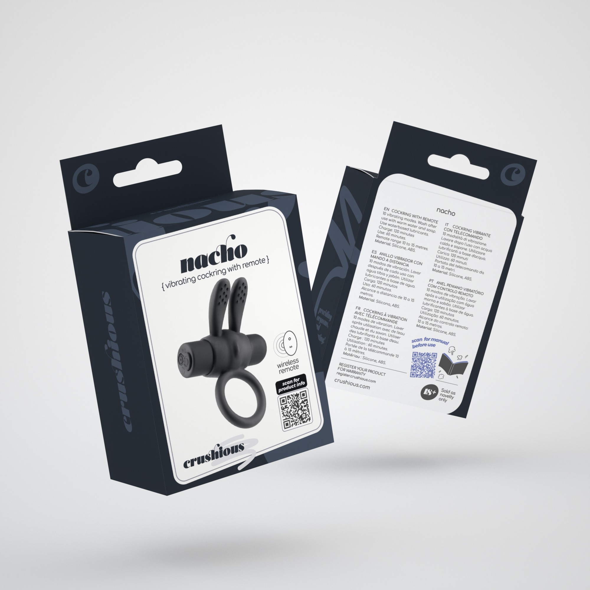 Nacho planeia proporcionar-lhe as ereções mais fortes de sempre! Está disposto a experimentar? Desfrute de experiências longas e agradáveis para si e para o seu parceiro.Com um toque suave e aveludado, esta bala e o anel são feitos de silicone seguro para o corpo, que não irrita a pele, é inofensivo para o corpo humano e não contém ftalatos.O Nacho é à prova de salpicos, não o submerja.Esta bala é para uso externo, não a utilize para uso anal.Com uma bateria recarregável de iões de lítio que dura até 60 minutos de diversão com cabo de carregamento USB incluído.Carregamento: 120 minutosUtilização: até 60 minutosPressionar o botão durante 2 segundos para ligar e desligar. Premir ligeiramente o botão para alternar entre modos.Utilização com controlo remoto:Ligar a bala.Prima o botão Ligar/Desligar no controlo remoto.Prima o botão de vibração para alternar entre os 10 modos.Premir o botão Ligar/Desligar para desligar.O controlo remoto utiliza 1 pilha CR2032 incluída.A limpeza é super fácil, basta lavar com água morna e sabão neutro ou utilizar um spray de limpeza para brinquedos. Utilize um spray de limpeza antibacteriano para obter melhores resultados. Secar e guardar longe de fontes de luz e calor.Aconselha-se a utilização de lubrificante. Utilize sempre lubrificantes à base de água. Os óleos e outros tipos de lubrificantes danificam a integridade do material.Os lubrificantes Crushious são o melhor complemento para os seus brinquedos Crushious.Consultar o manual de instruções antes da utilização.Dimensões:7,6 cm de comprimento; diâmetro expansível.Bala com 6,2 cm de comprimento.Material:Silicone, ABS