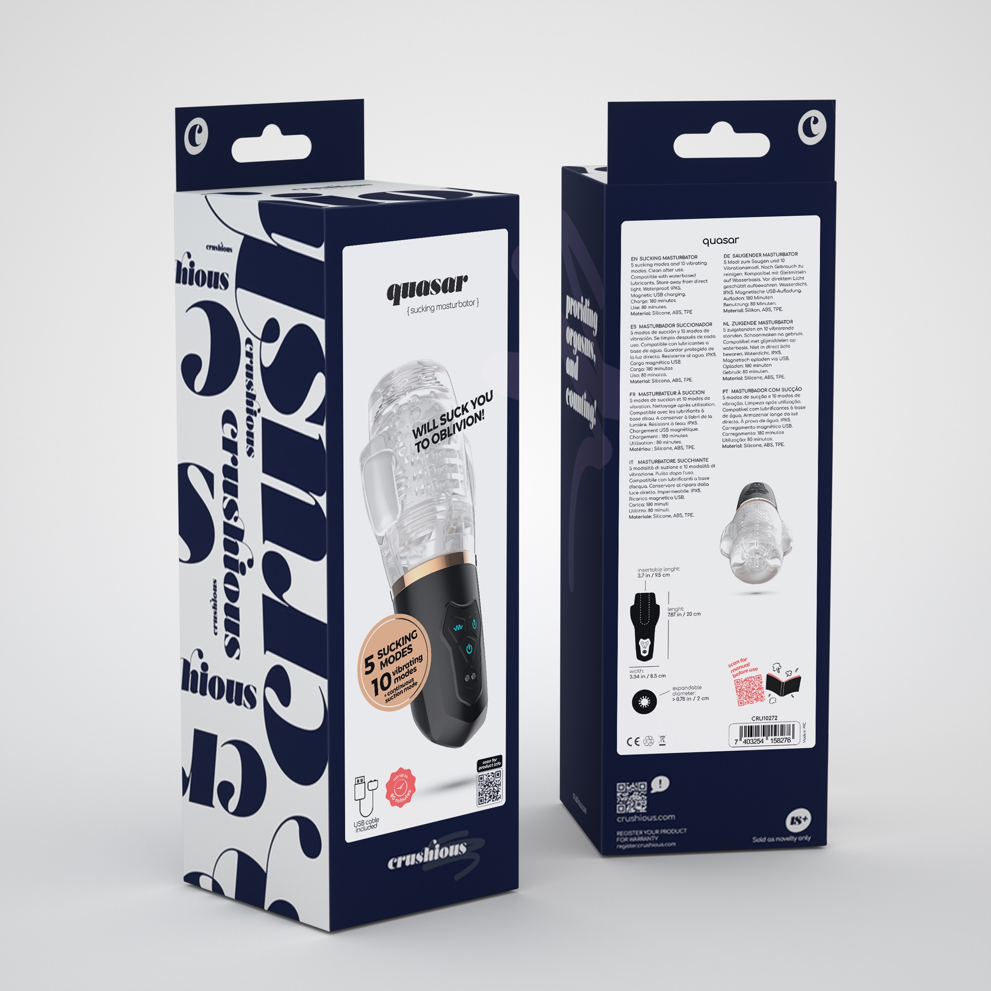 Alguma vez se perguntou quão forte é a sucção do espaço sideral?Deixe de se questionar, Quasar foi feito para lhe proporcionar sessões de masturbação estratosférica!Óptimo para jogos de masturbação a dois e a solo. Aumente a sua resistência e espessura antes das relações sexuais.Use-o sempre com lubrificante à base de água para melhores resultados.Use-o no duche ou banheira para experiências ainda mais quentes. Quasar é à prova de água e amigo do corpo.Quasar tem 10 modos vibratórios diferentes e 5 modos de sucção para você escolher. Alterne entre eles apenas tocando nos botões.Por favor, prima o botão central durante 3 segundos para ligar e desligar.Os brinquedos recarregáveis USB permitem-lhe utilizá-los com toda a sua potência de cada vez. Assegure-se de que a bateria é carregada antes da brincadeira.Por favor, carregue completamente antes de usar. A luz azul cintila quando se liga o carregador para assinalar que a bateria está a carregar. Quando a carga estiver completa, a luz está fixa. Carga completa durante 180 minutos.Use o seu Quasar durante 80 minutos.ATENÇÃO!Não puxar nem torcer a copa durante uso e limpeza.Limpar é num abrir e fechar de olhos, limpe a base com um pano húmido ou usar um spray de limpeza de brinquedos. Lave a taça com água morna e sabão neutro ou use um spray de limpeza de brinquedo. Seque e guarde longe de fontes de luz e calor. O masturbador deve ser armazenado separadamente de outros brinquedos.O uso de lubrificante é aconselhado para uma melhor experiência. Utilizar sempre lubrificantes à base de água. Os óleos e outros tipos de lubrificantes irão danificar a integridade do material.Os lubrificantes Crushious são a melhor adição aos seus brinquedos Crushious.Por favor, consulte o manual de instruções antes de utilizar.Dimensões:20 cm de comprimento; 2 cm de diâmetro interno expansível.Material: TPE, ABS, Silicone.
