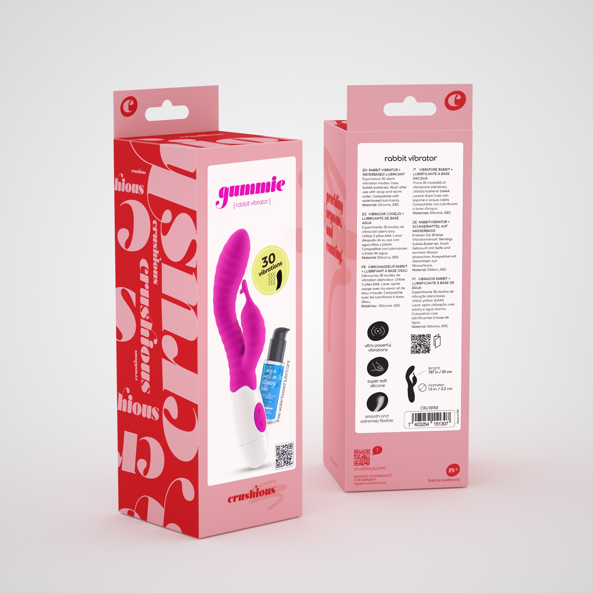 Gummie é tudo o que precisa para momentos deliciosos.Prove os orgasmos mais deliciosos com Gummie, o miminho mais doce de sempre!O simples toque de um botão alterna os modos e o seu eixo com nervuras oferece estimulação às suas paredes internas.Feito de silicone macio e de alta qualidade, oferece 30 fabulosas vibrações silenciosas.Para tirar o máximo partido, sugerimos a utilização de lubrificantes à base de água Crushious.Gummie é perfeito para jogos aquáticos, uma vez que é à prova de água.Funciona com 2 pilhas AAA, incluídas. Retirar as pilhas quando não está a ser utilizado.Lavar com água morna e sabão neutro, utilizar um antibacteriano específico para brinquedos para uma melhor limpeza.Armazenar longe da luz solar e de outros brinquedos.Material: Silicone, ABS.Dimensões: 20cm de comprimento; 3,2cm de diâmetro.Inclui lubrificante à base de água Crushious de 50ml.