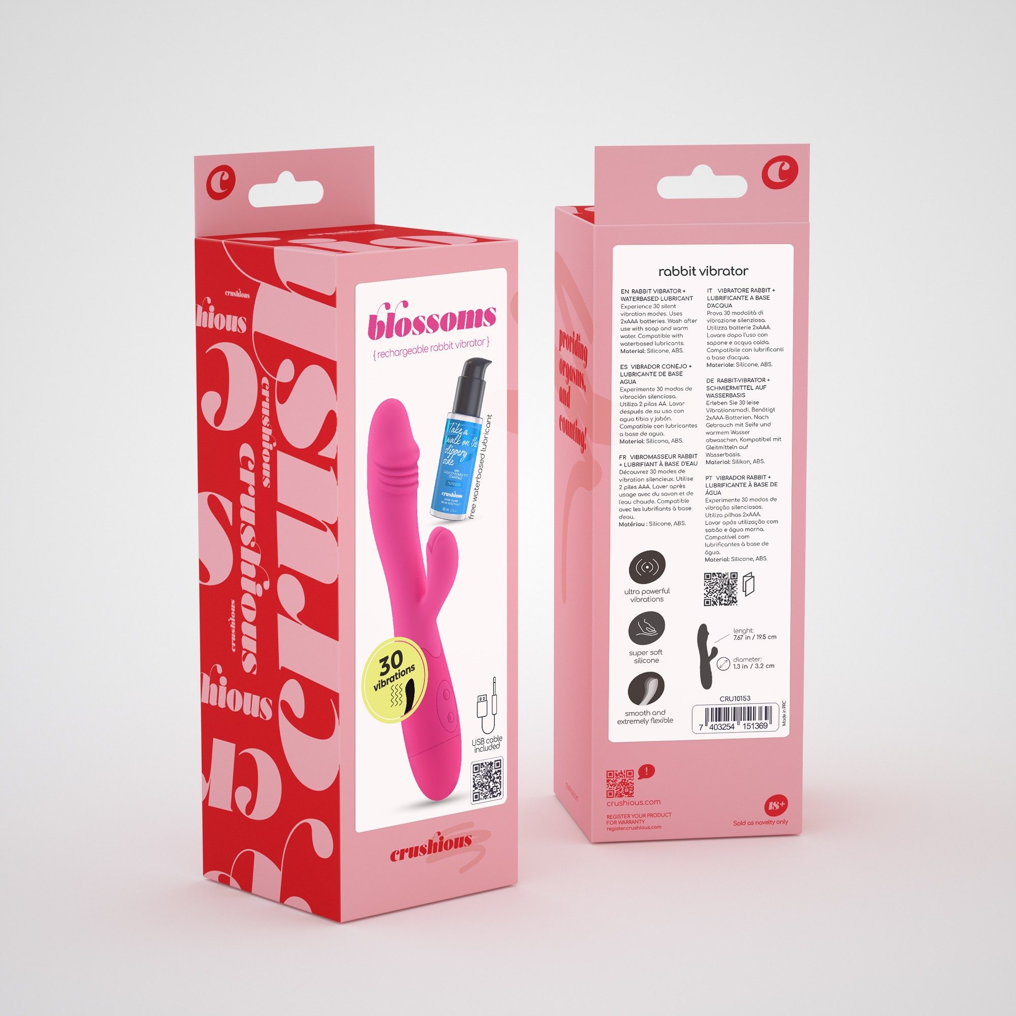 Assim como uma flor que nasce no deserto, este incrível vibrador contempla um poder capaz de proporcionar orgasmos que abalarão a terra.Blossoms é facilmente controlado através dos botões e pode escolher as suas combinações favoritas.Feito de silicone macio e de alta qualidade, oferece 30 fabulosas vibrações silenciosas.Para tirar o máximo proveito, sugerimos a utilização de lubrificantes à base de água Crushious.Blossoms é perfeito para jogos aquáticos, uma vez que é à prova de água.Recarregável através de cabo USB, rodar a base para a conectar. Carrega totalmente em 60 minutos e proporciona 90 minutos de pura alegria.Não utilizar enquanto carrega. Uma luz vermelha irá acender ao carregar e apagar-se-á quando a carga estiver completa.Premir o botão de power para ligar e desligar, usar o botão de vibração para alternar entre modos.Lavar com água morna e sabão neutro, usar um antibacteriano específico para brinquedos para uma melhor limpeza.Armazenar longe da luz solar e de outros brinquedos.Material: Silicone, ABS.Dimensões: 19,5cm de comprimento; 3,2cm de diâmetro.Inclui lubrificante à base de água Crushious de 50ml.