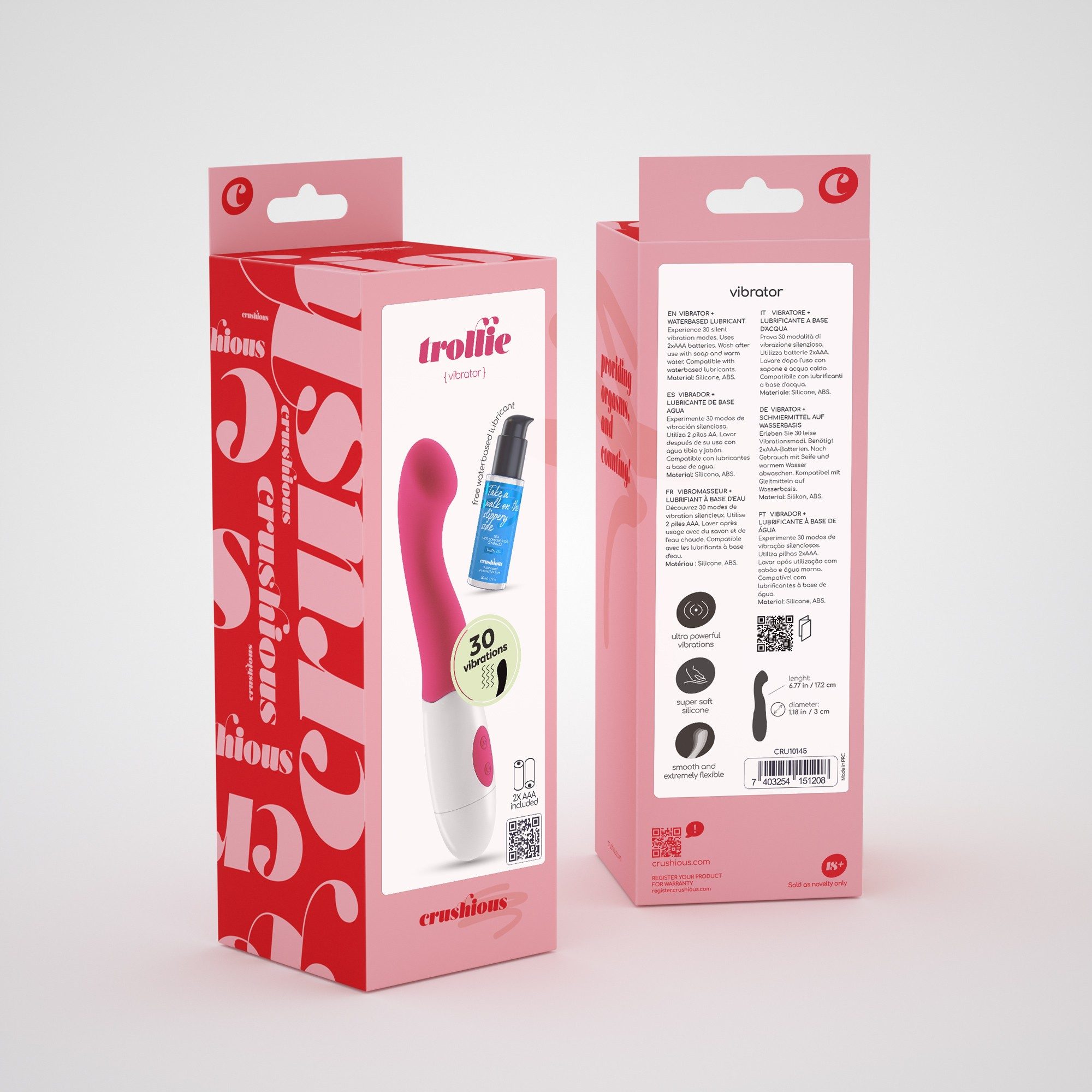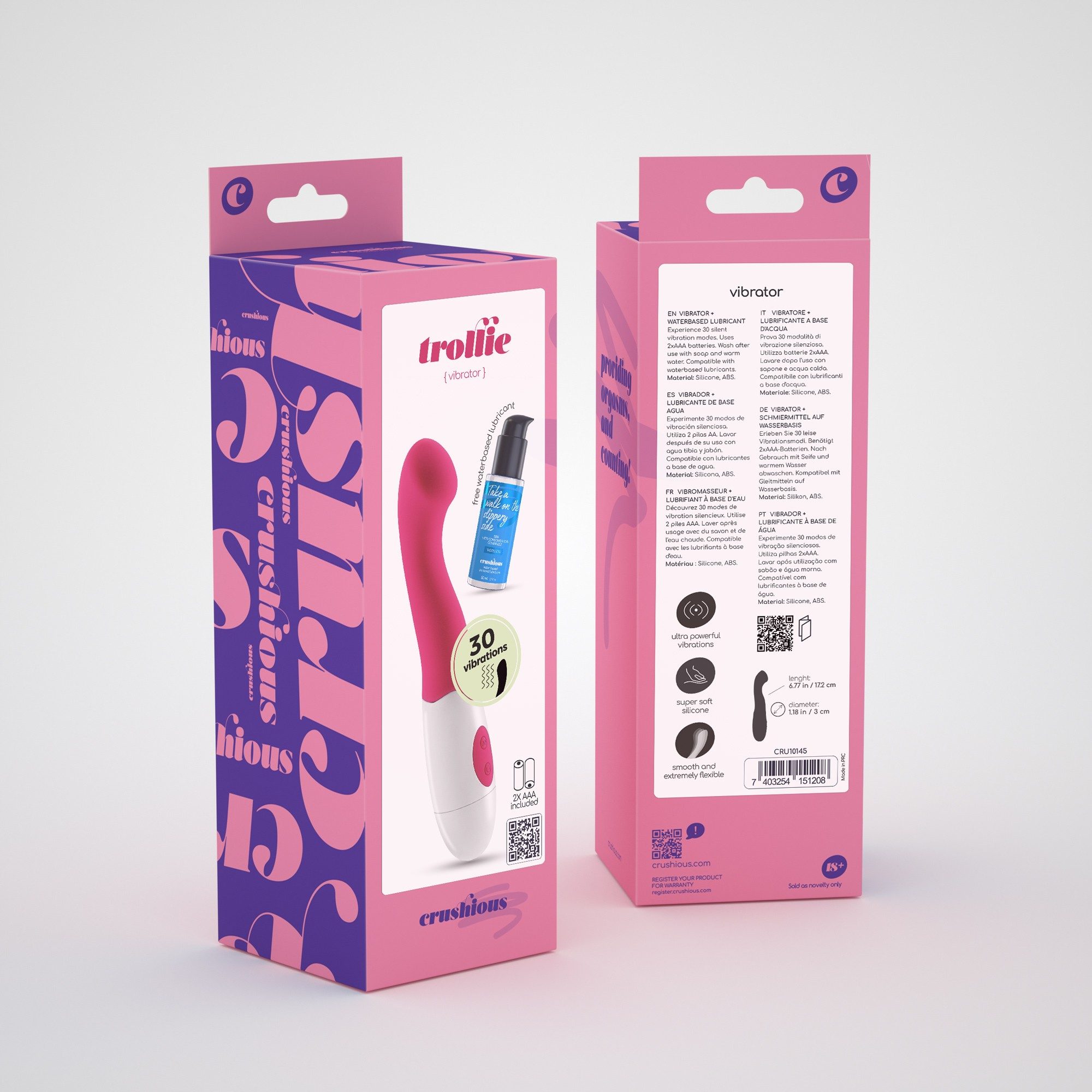 Trollie irá bater até que você abra.O simples toque de um botão alterna os modos, e a sua ponta arredondada irá derrubar o seu Ponto-G.Feito de silicone macio e de alta qualidade, oferece 30 fabulosas vibrações silenciosas.Para tirar o máximo partido, sugerimos a utilização de lubrificantes à base de água Crushious.Trollie é perfeito para jogos aquáticos, uma vez que é à prova de água.Funciona com 2 pilhas AAA, incluídas. Retirar as pilhas quando não está a ser utilizado.Lavar com água morna e sabão neutro, utilizar um antibacteriano específico para brinquedos para uma melhor limpeza.Armazenar longe da luz solar e de outros brinquedos.Material: Silicone, ABS.Dimensões: 17,2cm de comprimento; 3cm de diâmetro.Inclui lubrificante à base de água Crushious de 50ml.