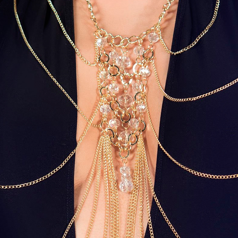 DESCRIÇÃO:Um colar para o corpo, dourado com correntes de diferentes tamanhos, que se unem na zona do peito, com pendentes brilhantes. Possui fecho ajustável na parte traseira. Uma ideia original para embelezar um vestido ou dar destaque ao corpo com classe e elegância.