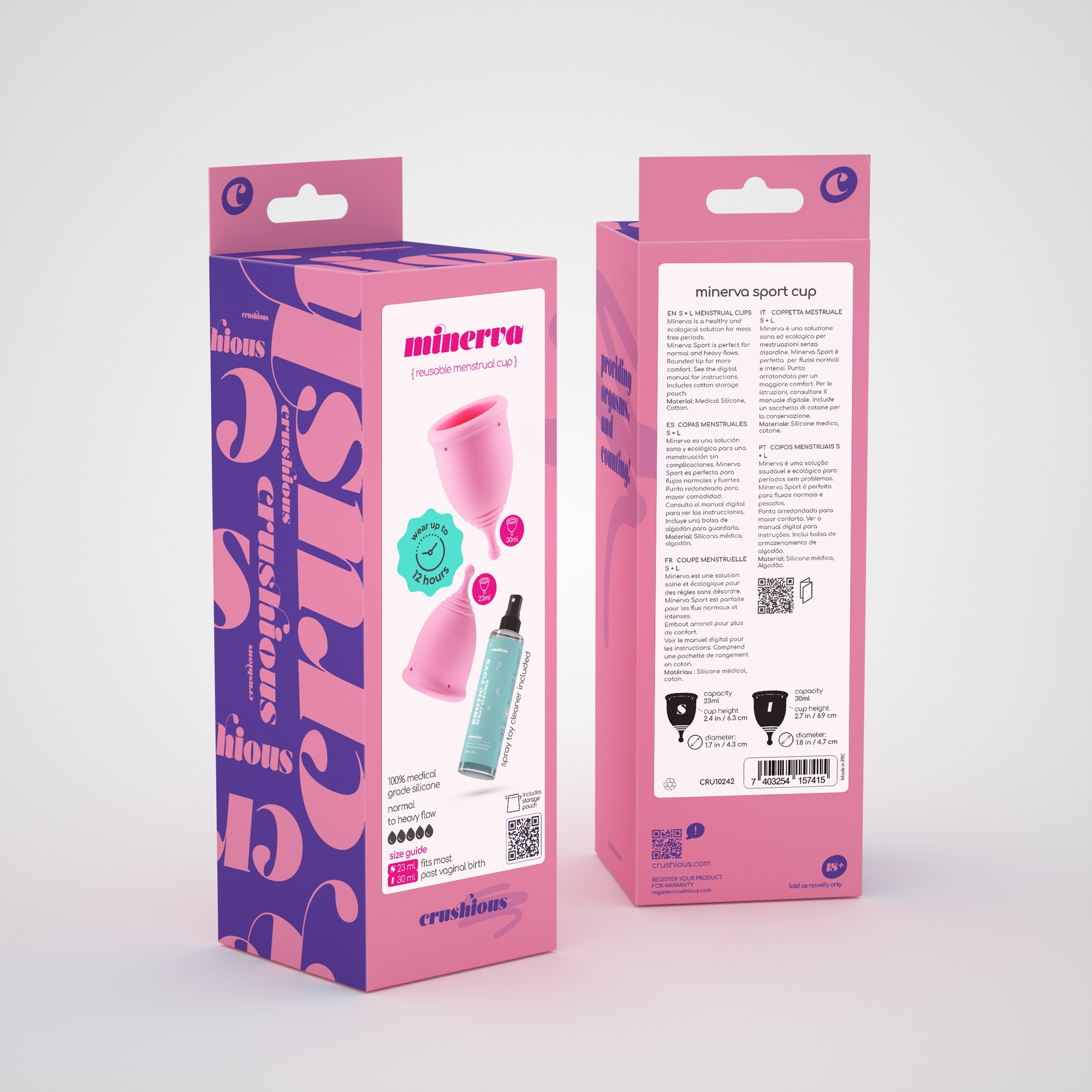Minerva é a solução perfeita para lidar com a menstruação de forma saudável, económica, prática e ecológica.O copo recolector Minerva é apresentado em 3 tamanhos diferentes para melhor se adequar a si e ao seu corpo, podendo assim ser usado pela maioria das mulheres.Minerva assenta no seu interior e torna-se impercetível quando bem colocado, a sua extremidade arredondada permite um conforto extremo mesmo praticando desportos de intensidade.Minerva é feito de silicone de grau médico e é feito de uma só peça sem costuras, minimizando qualquer incómodo.Minerva é indicado para mulheres de qualquer idade que não utilizem DIU nem tenham recebido qualquer contra indicação por parte do seu médico.O copo recolector menstrual funciona através de vácuo e é muito fácil de utilizar, veja por favor o manual digital disponível aqui e através do código QR na embalagem.Minerva pode ser utilizado até 12h sem retirar e tem uma duração entre 5 e 10 anos.Cuide do seu Minerva de acordo com as nossas sugestões e diga olá a períodos mais seguros, sem odores, sem manchas e muito mais ecológicos.Recomendações de Uso:Esterilize o seu copo antes da primeira utilização. Deixe a água ferver por 5 minutos.Lave bem as mãos antes e depois de manipular o seu copo.Pode utilizar água ou lubrificante de base água para auxiliar a inserção.Experimente várias dobragens até encontrar a que mais se adequa a si.Garanta que o copo é inserido corretamente e puxe ligeiramente para comprovar que está a fazer vácuo.Pode agora usar o seu Minerva até 12h consecutivas.No momento de tirar o seu copo, sente-se confortavelmente na sanita, puxe pela extremidade enquanto belisca ligeiramente a base. Despeje o conteúdo.Passe o seu Minerva por água ou passe um pano.Pode agora voltar a colocá-lo.Não necessita lavar ou esterilizar durante o ciclo.Após a utilização lave bem o seu copo com sabão neutro e água morna. Use o Toy Cleaner da Crushious para maior eficácia. Enxague e esterilize por 10 minutos.Deixe secar e guarde na bolsa de algodão.No ciclo seguinte volte a repetir todos estes passos.Atenção!Não partilhe o seu Minerva.Não utilize durante as relações sexuais.Não utilize copos recolectores menstruais caso use dispositivos intrauterinos, o vácuo pode deslocar o mesmo, podendo provocar ferimentos e ineficácia desse método anticoncecional.Escolha o Minerva mais indicado para si!XS ? O Minerva XS é indicado para jovens e para mulheres com fluxo ligeiro que não tenham tido qualquer tipo de parto.S ? O Minerva S é recomendado pra mulheres com fluxo médioL ? O Minerva L é recomendado para mulheres com fluxo intenso e que tenham tido pelo menos um parto por via vaginal.O seu copo Minerva é apresentado na versão simples com bolsa de armazenamento e na versão pack, com spray limpador incluído.Consulte as instruções para saber como melhor usar o seu Minerva, a utilização correta do seu Minerva pode levar até 3 ciclos, não desista se não conseguir posicioná-lo corretamente na primeira tentativa.Dimensões:6,3 cm x 4,3 cm.6,9 cm x 4,7 cm.Capacidade:23 e 30 ml.O nosso Toy Cleaner é apresentado em spray para uma utilização mais fácil e para cobrir áreas maiores em cada bomba.Ser não perfumado e fácil de aplicar garante uma experiência agradável e discreta.Crushious Toy Cleaner é seguro para usar com o seu copo e com qualquer brinquedo sexual. Por favor, assegure um enxaguamento adequado após a aplicação.Aplicação: Utilização combinada com limpeza regular para aquela limpeza extra, ou utilize-o separadamente. Pulverizar diretamente sobre a superfície do artigo que necessita de ser limpo. Esfregar e limpar com um pano húmido ou enxaguar com água. Em seguida, esfregar a peça até secar.Atenção: Pode causar irritação nos olhos. Manter fora do alcance das crianças. Lavar após manuseamento. Evitar o contacto com os olhos.SE EM CONTACTO COM OS OLHOS: Lavar com cuidado com água durante vários minutos. Retirar lentes de contacto, se presentes e fácil de fazer. Continuar a enxaguar. Se a irritação ocular persistir: Obter aconselhamento/atenção médica.Armazenamento: à temperatura ambiente no recipiente original. Após a abertura, utilizar no prazo de 12 meses. Contém mistura de 2-metilisothiazolin-3-ona e 5-cloro-2-metilisothiazolin-3-ona. Pode produzir uma reacção alérgica.Contém: < 5% - Tensioactivos não-iónicos - Tensioactivos aniónicos; Metilcloroisotiazolinona, Metilisotiazolinona